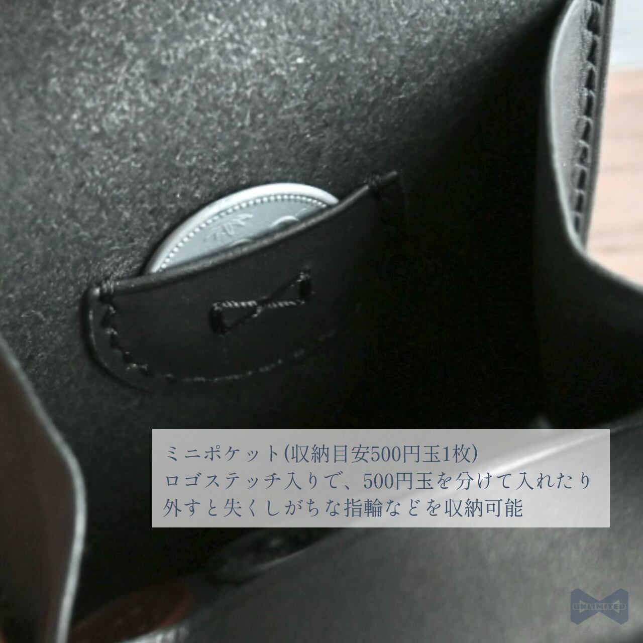 ・小銭入れの内部にはロゴステッチ入りの隠しポケットがあり、500円玉や指輪など平たいものを収納可能